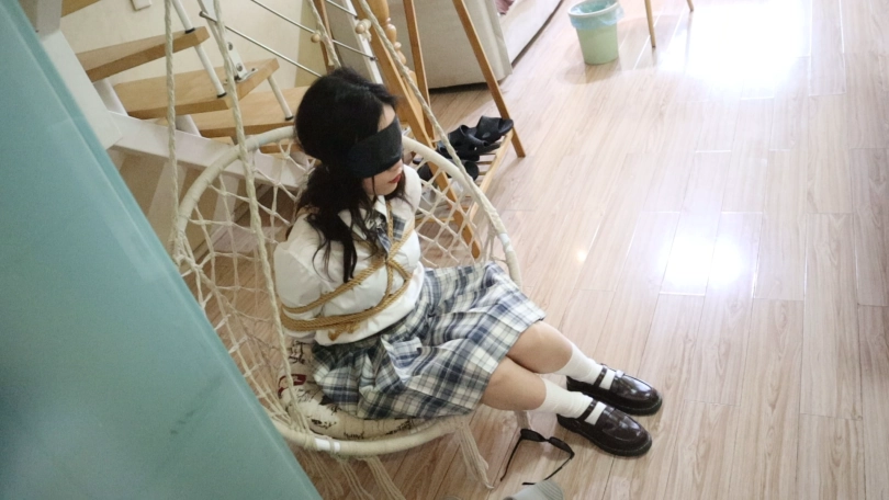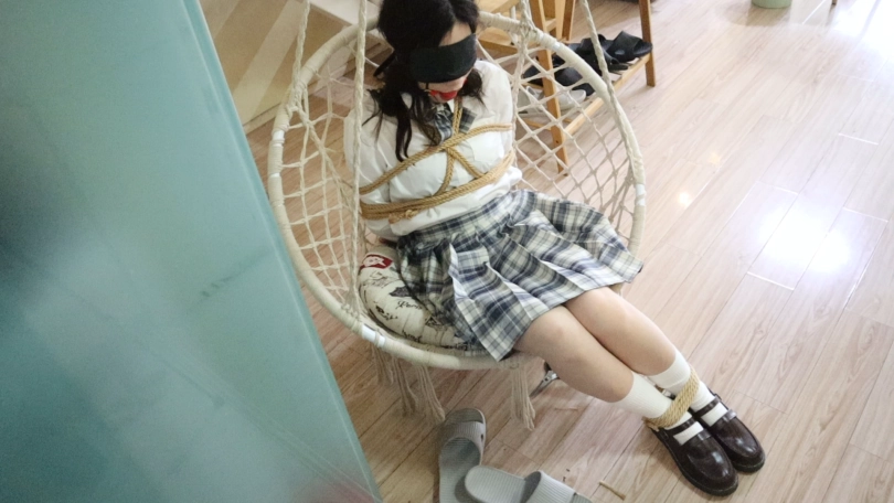 累了就自己在吊篮上坐一会当然也是全身被绑着,后面把西雅的鞋子脱下来,让她腿和脚完全被绑着的情况下跪了下来,口水不停地在滴