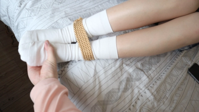 ,慢慢挣脱绑在卫生间杆子上的绳子之后,慢慢向卧室移动,全身紧紧的绑住,穿着白棉袜的小脚只能缓慢的移动,一步一步,