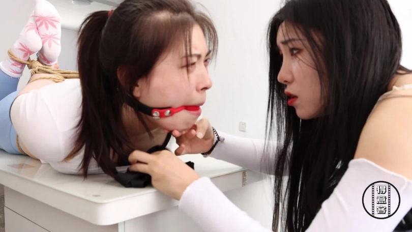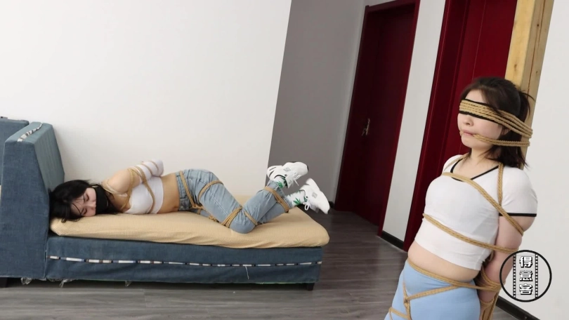 应聘陷阱完结篇,因此请来了两位颜值加实力并存的诗涵(吴晗)和星宇,希望大家喜欢,作为完结篇精彩奉献。剧情介绍,妹妹被绑架折磨,还是忍不住出卖了姐姐,一个电话把姐姐骗来。半个小时后,姐姐来了,发现门没关就直接进来,走到客厅发现在桌子上被直臂缚驷马倒攒蹄的妹妹后大吃一惊,回过神来马上跑过去想帮妹妹解开绳子,她先解开妹妹的蒙眼布,然后想方设法解开妹妹的绳子,沉浸在解绳子中的她忘记了身后出现的坏人,妹妹惊恐地发出呜呜呜的声音提醒,她却不理解,然后就被歹徒在背后抓住了,然后用刀威胁,接着就是五花大绑上半身,绑上股绳,捆好大腿根,膝盖,小腿,脚腕,捆绑完毕后当然还是少不了堵嘴的,一双白袜子,一条黑布把她嘴巴堵得严严实实。之后坏人将姐姐扔在沙发上,然后解开妹妹驷马,把她押解到柱子边让他从跪下,让她跪着绑在柱子上,再把嘴巴,眼睛都绑上绳子和柱子绑一起让她动惮不得,之后在姐姐身上搜出了银行卡和手机,然后让姐姐躺沙发上后离开。坏人离开后,姐姐爬到妹妹身边,含糊不清说道。你帮我解嘴巴,我帮你解绳子。之后妹妹帮她解开嘴上的封堵物,姐姐用牙解妹妹绳子。就在快成功时,坏人回来了。一气之下,用丝袜堵姐姐嘴,再贴上厚胶布,接着用绷带绑上。然后肯定是放倒在地上驷马倒攒蹄并强制抬头。之后坏人拿刀问妹妹这是谁的主意,妹妹又把姐姐卖啦,说都是姐姐的主意。这下有姐姐好受的了,帆布鞋绑姐姐脸上让她好好闻一闻,接着挠脚心,踹她。一会就把坏人累得不行,决定去休息。最后两姐妹被坏人并排驷马倒攒蹄强制抬头并排放置在一起,让她们继续挣扎。