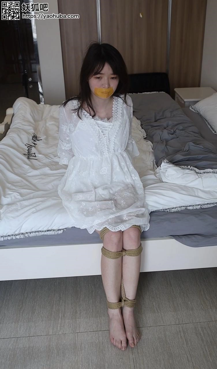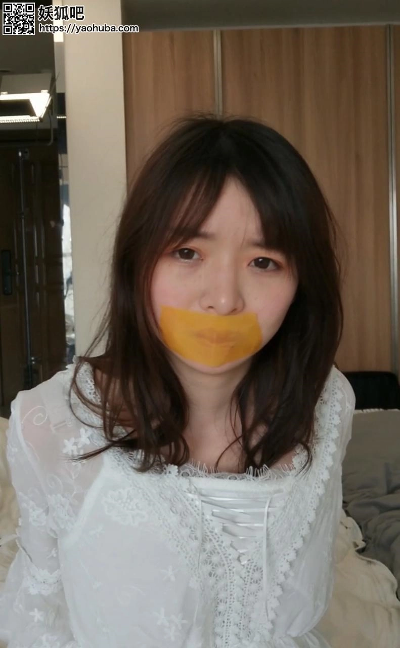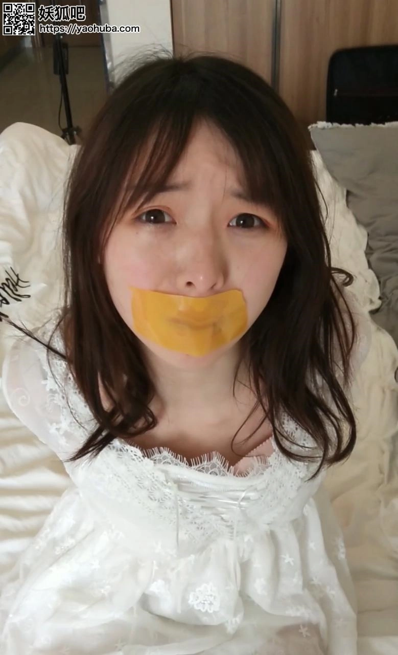 潇潇身着白色纱裙,被黄色封箱胶带贴嘴,反绑双手挣扎,拍摄角度蛮不错,喜欢胶带的看下