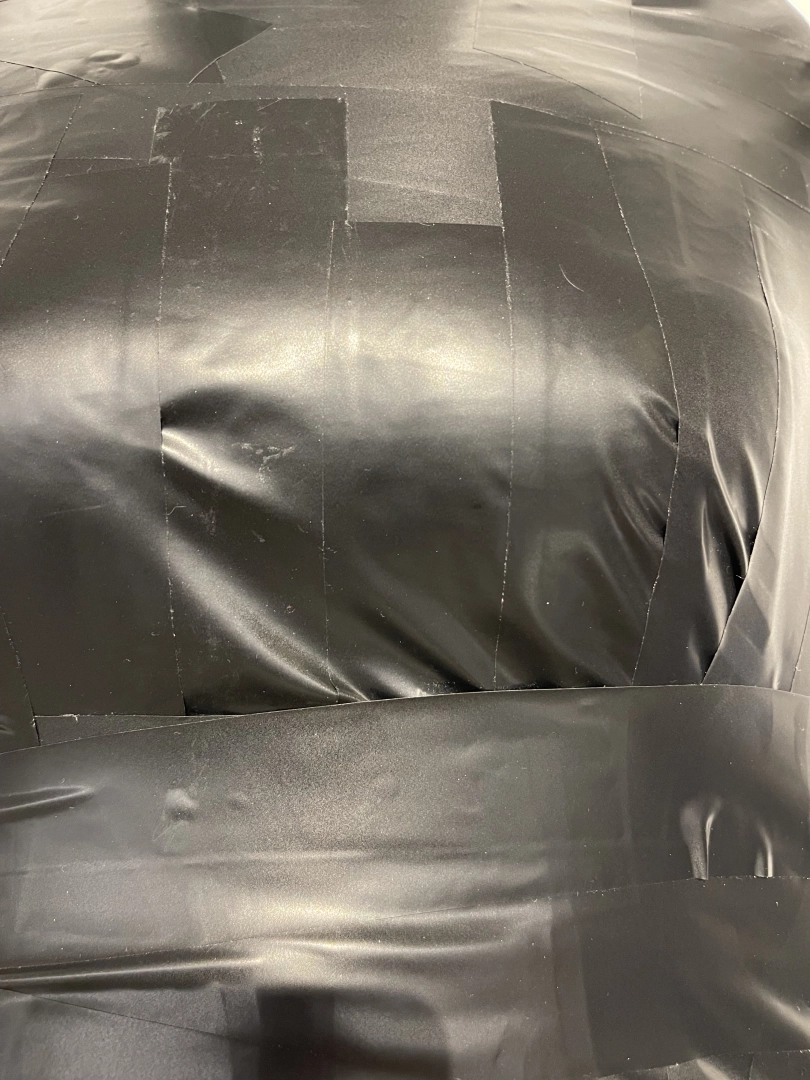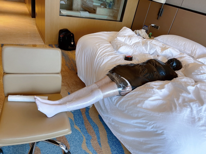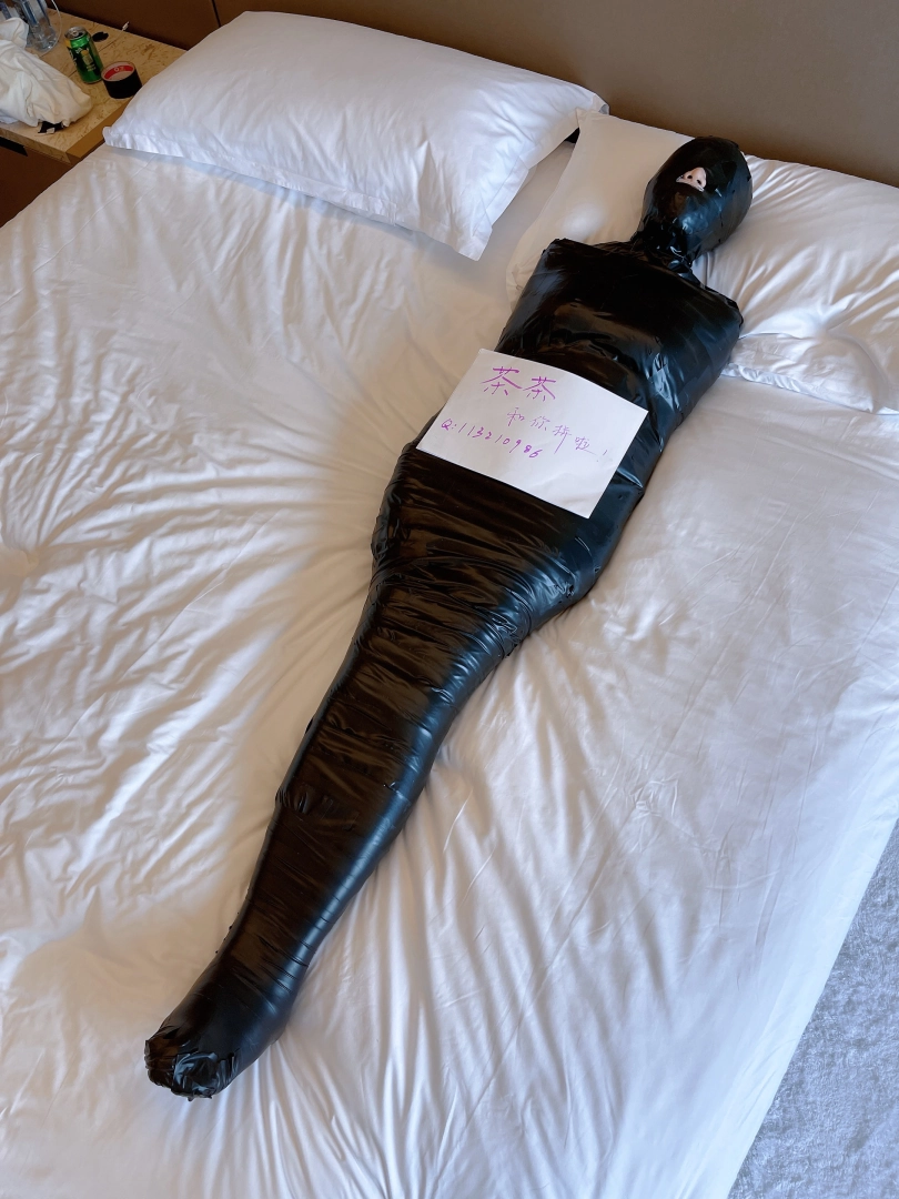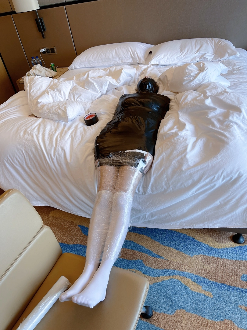 首先用保鲜膜和胶带把茶茶绑成木乃伊,绝对拘束没有一丝一毫脱出的可能。可爱的少女茶茶就这样从人变成了一个物品,只能静静放置着。娇小可爱的身体被黑色胶带包裹后更加像一个可爱的艺术品一样。