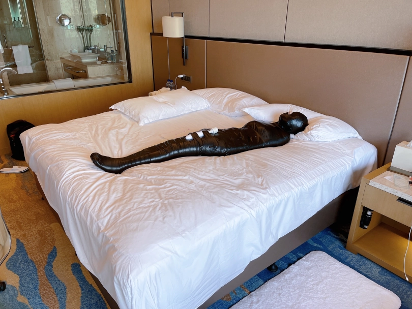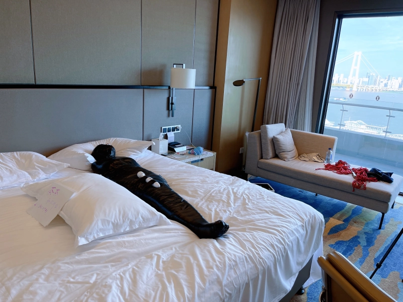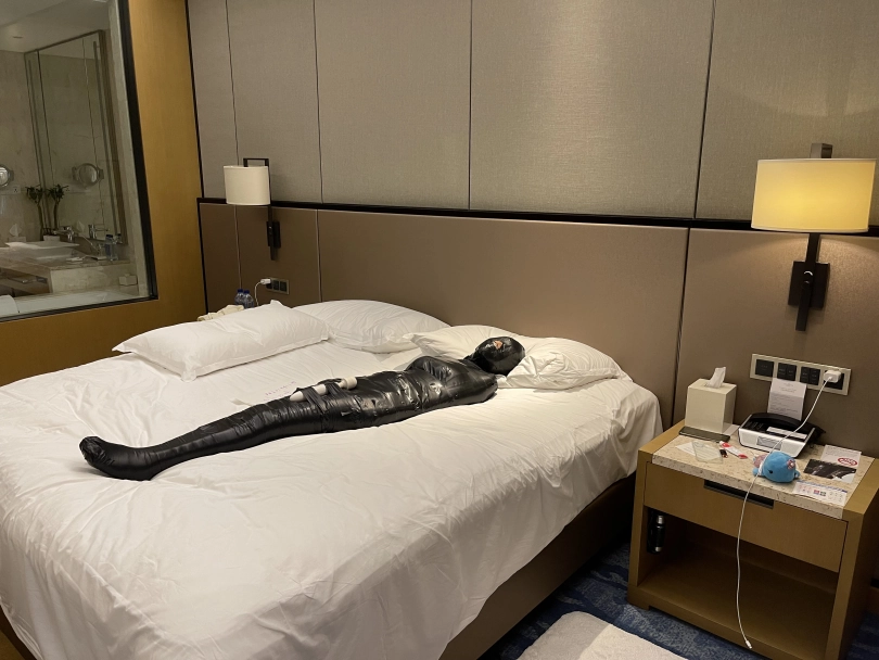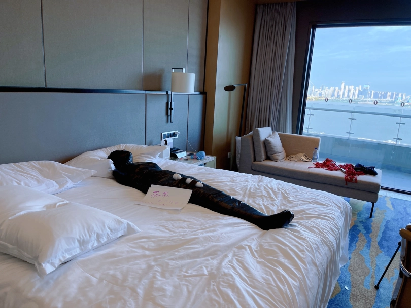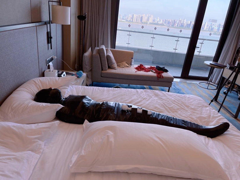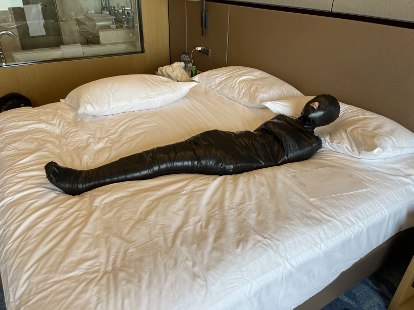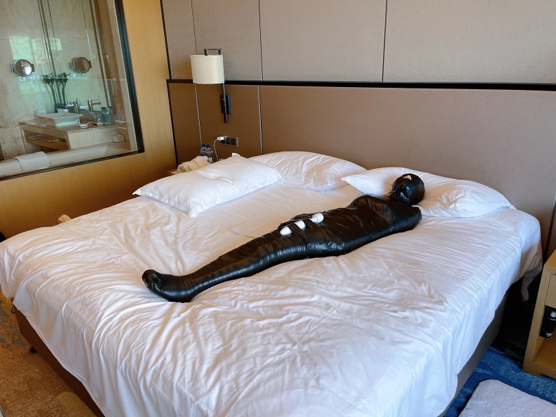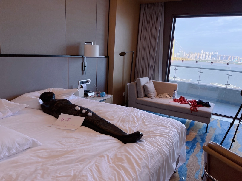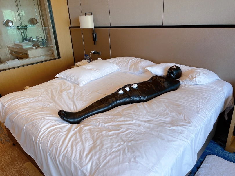 怕茶茶无聊,还给茶茶加上了小话筒,此时的茶茶目不能视,口不能言,耳不能听,身体动弹不得,感官陷入一片黑暗,只能在黑暗中静静感受紧贴皮肤的绝对拘束感。