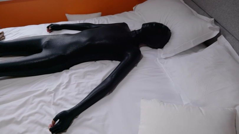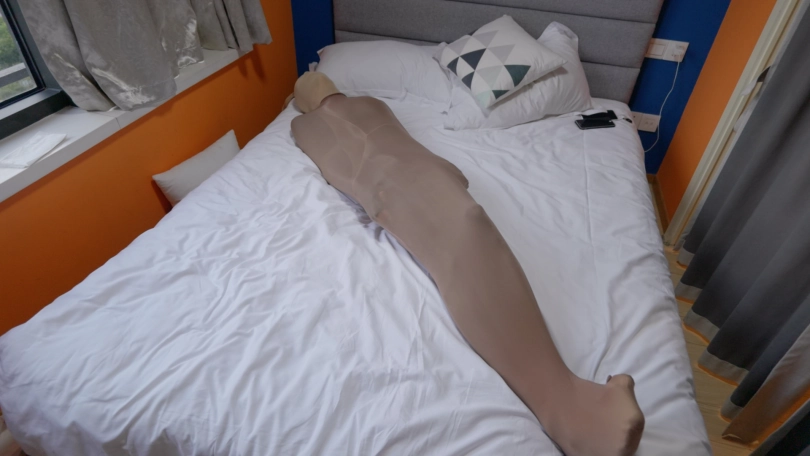 小伙被女S迷晕后,被换上了全包紧身衣,女S先是脱掉一件身上的丝袜把小伙的头包住,再脱掉一条丝袜把他包成木乃伊,这时候小伙也醒了,女S就拿之前被小伙拿来包头的丝袜睡袋把小伙装了进去,向他展示了丝袜睡袋的正确用法。绑完人后女S出去休息一下,结果小伙打算逃走,但是被包起来了自然无法逃脱,于是被抓回去后,女S又给他加固,上了好几条皮带。最后小伙也放弃逃脱了,安心做女王的玩具陪她看电视,没想到女S最后拿出了她的振动玩具……