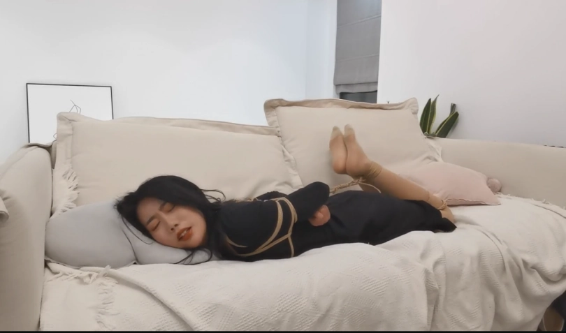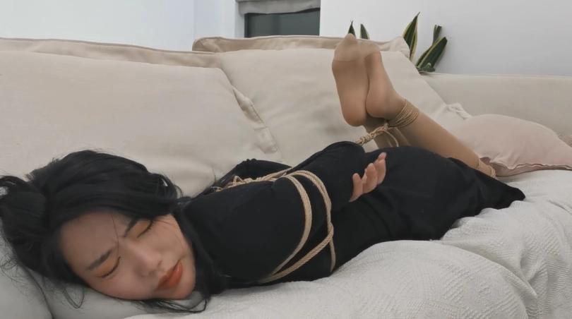 第二幕:若若坐到沙发上说:“我平时衣服比较多,所以绳子可能要结实一点。你这绳子质量怎么样?”(放心,我们公司的绳子质量绝对没问题,捆一头牛的都没问题,何况几件衣服)。若若:“真的假的?那你来把我的脚捆起来,我看我自己能不能挣脱”(暗自窃喜,没想到,卖个绳子,还有这种福利),我拿起绳子,走了过去…,因为怕勒疼她,我没绑的很紧,留了不少的空间,心里想着:这小美女看起来弱不禁风的,应该是挣脱不了的。捆好若若的双脚,若若尝试着挣扎了一下说到:“你确定你捆紧了嘛?我怎么感觉松松垮垮的”,说到这里,若若双手撑在沙发上,一用力,绳子就从她的脚上滑落了下来。“这就是你说的能捆一头牛,我这么轻松就解开了。这质量…”我瞬间一头黑线…,没想到这小美女,还是个练家子,似乎经常被绑的样子,轻敌了…。我慌忙解释道:我是怕勒疼小姐姐,故意绑的这么松的,和绳子的质量没啥关系。若若:“那既然这样的话,你在把我绑起来一次吧,把我的手和脚都捆起来。这次你可要捆紧一点。不用怕我疼,要是在被我解开了,我可不买你的绳子~”我心里暗喜:哼,偷偷躲在被窝里看绳艺的套路,今天终于派上用场了…,看我不把你绑的求生不得…。看着手中的绳子,脑海中浮现出若若被捆绑的样子。