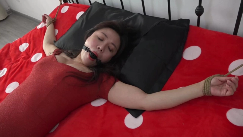 李然在家遭遇歹人(锁哥)袭击,迷晕后大字绑放置在床上,李然从昏迷中惊醒一番苦苦挣扎挣脱开手腕捆绳,起身给脚踝处捆绳解开,活动手脚后想拽出嘴里塞口球。
