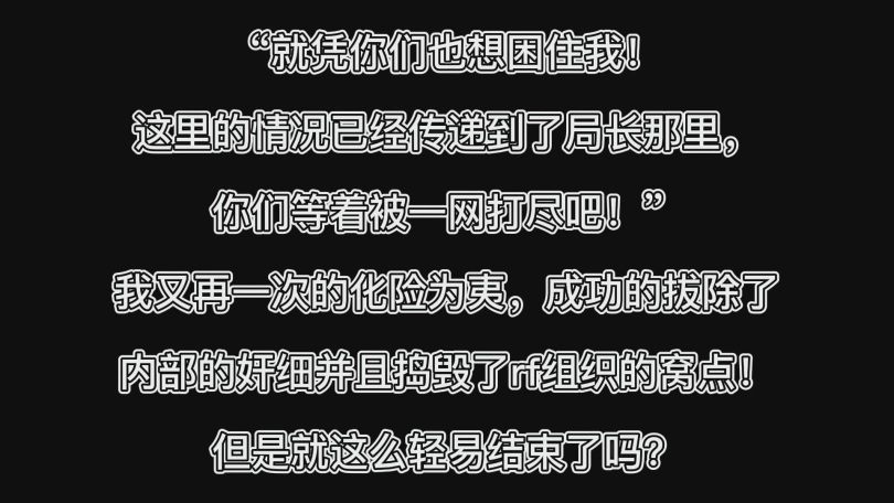 我又再一次的化险为夷,成功的拔除了内部的奸细并且捣毁了rf组织的窝点!