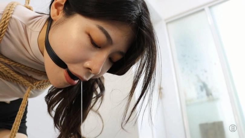 老板把米娅上身日式紧缚,双腿并拢绑,把她直立踮脚吊起来,股绳也用绳子连到横梁上,带口球。老板说把你吊在这罚站,得好好的折腾折腾你,拿出了鞭子和毛刷,一边应鞭打米娅,一边用毛刷挠她的脚心。米娅脚都站酸了,只能不停的发出呜呜的声音。之后老板说我也玩累了,我看你也站累了,怎么样要不要给你换一个舒服点的姿势。老板把她放下来让她跪在地上,用绳子连接膝盖上的绳子和胸上的绳子使她弯腰,身后的绳子连到吊绳上,在身前放一个接口水的的杯子。老板说你就在这跪着好好反省吧,然后老板出去,只留下了米娅一个人挣扎,口水止不住的流进了身前的杯子里。