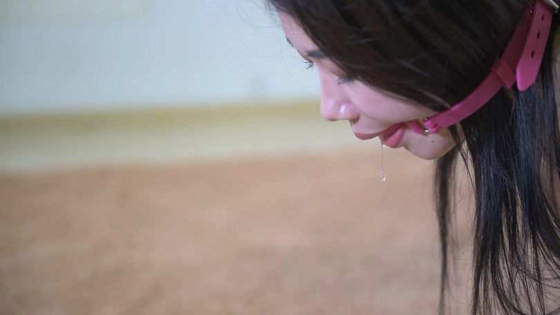 创意惩罚,小娜双手被绑在身后,用绳子连着一个杠铃片并带上脚镣拖着行走,这个杠铃片看着不大,其实挺重,模特出身的小娜没有经历过这样惩罚,走了很多圈,放置休息的时候累得差点靠在沙发上睡着。然后是罚跪,身材好跪着的姿势也是很美,再带上口球不断流出口水的样子更是美不胜收。