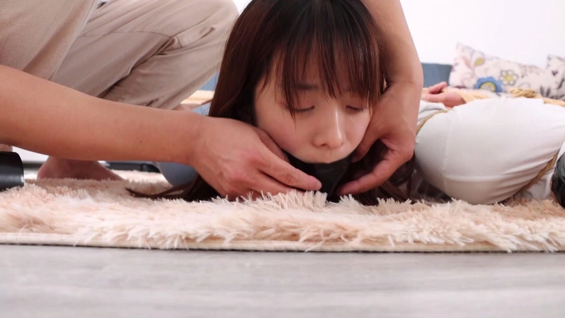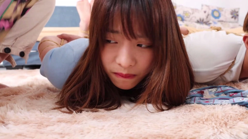 女孩和自己男友在家遭遇歹人入室抢劫,劫匪将二人手脚简单捆绑后取下二人口中的塞口球,分别脱掉二人脚上穿的锦纶丝袜塞入他们口中,而后继续去屋里翻找财物。