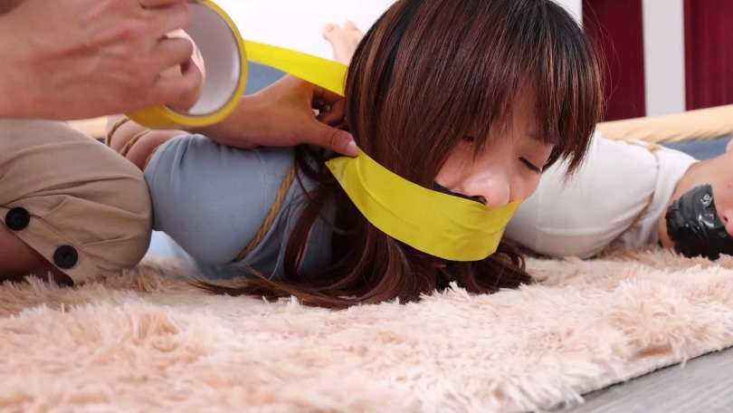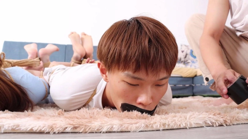 生气的劫匪将情侣二人驷马捆绑放置在沙发前地上,并说给二人换个东西塞嘴,拽出情侣二人口中原味锦纶丝袜后分别用两条丝巾塞入他们口中,并用黑色宽胶布剪下5张封嘴,再用黄色胶带和黑色弹力自粘绷带缠绕多圈将二人嘴封严实。