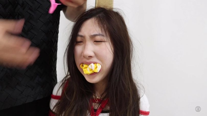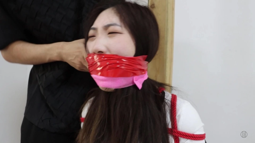 安安上半身被日式紧缚,下半身跪着的姿势,紧紧的捆绑在柱子上。大哥走了过来,抓住她的头把她弄醒,然后解开她的耳塞,让她老实听话,安安点头答应后,大哥把她眼睛的胶带撕下,接着解开嘴巴上的胶带,就在大哥整理胶带时,安安把内裤吐了出来并说着受不了了,此举动激怒了大哥,大哥抓住她嘴巴捏开张大,然后将一双臭耐克袜子塞了进去,接着用几块透明胶带封上。封堵完毕,安安只能发出呜呜呜声音,大哥拿来鞭子毛刷,来到安安身后,脱了她的空军一号鞋子,再接着把大白棉袜也脱掉,光着脚。安安只能光着脚又不能动弹的接受大哥的挠脚心了!挠完脚心,大哥又将鞋袜拿到安安面前,让她闻袜子,闻鞋子,闻后安安含糊不清说:受不了了,想吐。大哥帮她撕下胶带,胶带一撕开,安安就忍不住把耐克袜子吐出,这举动召来大哥的不满,大哥马上让她闭嘴,然后拿来杯子让她把口水吐到杯子里,等安安吐了口水后,大哥将一双黄色麻叶袜子塞入安安嘴巴里,接着用粉色绷带缠绕封上,再用红色静电胶带封住嘴巴,安安的呜呜呜声音越来越小,大哥拿来鞭子命令她把头靠在柱子上,不然就抽她的脸,安安照做头靠柱子,身体接受鞭打。一鞭一鞭抽下去,安安一声一声的呜呜呜却越来越无力,最后晕了过去。