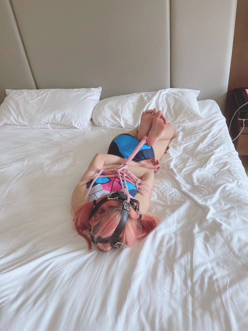 这就是小茶茶的状态:被极限驷马绑的结结实实、连小脑袋都被迫抬起来。硕大的马具口球卡着嘴巴和下把,让茶茶几乎发不出呜咽声、敏感的小脚丫承受着[X_X]的持续刺激,全身又要时不时承受她最畏惧的电击痛苦。