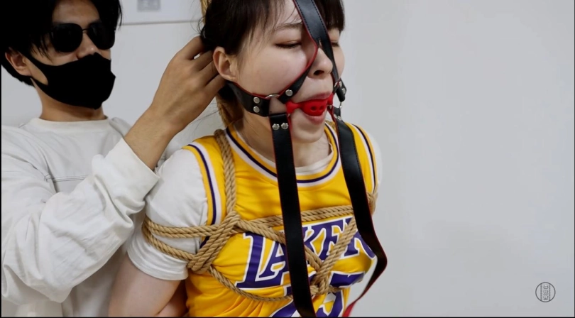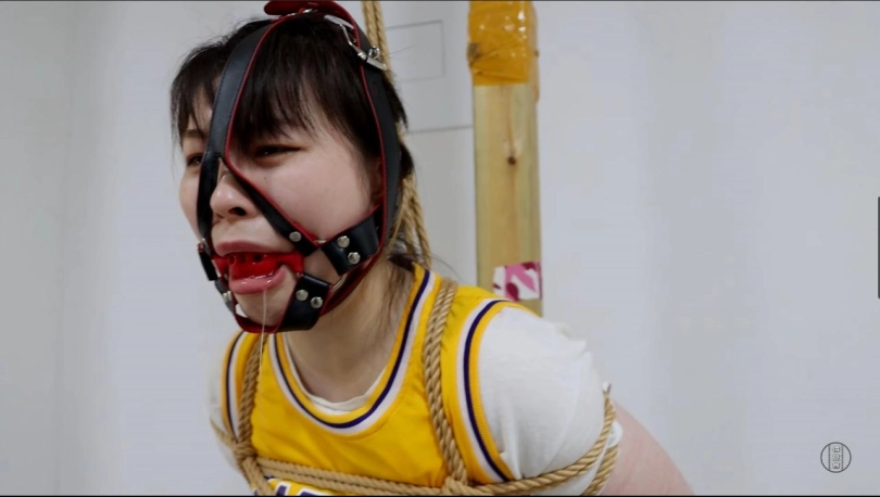 星宇这种态度没有维持太久,军哥取来一副钢制脚镣锁住她的脚踝,散发汗臭味的白棉袜脚勉强踮起脚尖支撑着星宇被绑缚的身体,然后,一个马具口球便被塞入星宇的嘴里,在口球的作用下,星宇的一切声音都被转换成动听的呜呜声。