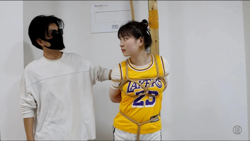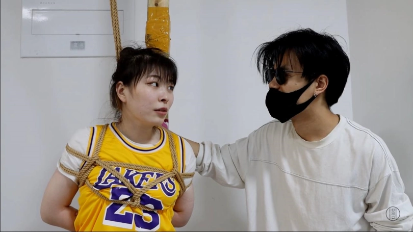 军哥开始了他的报复行动。首先将星宇吊绑起来,让她勉强脚尖着地,胸前的绳子将丰满的胸部突出,[X_X]的绳子跨过运动短裤深深的勒进[X_X],令星宇的挣扎动作加入了些异样的[X_X]。