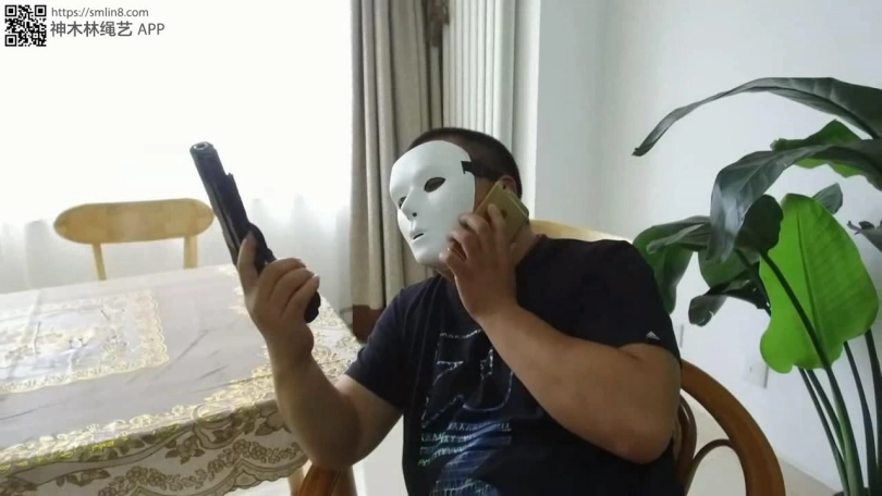 美女奋力挣扎,想摩擦开口罩,但失败了,想用桌脚摩擦沙发也失败了,最后绝望的对着窗户大喊。