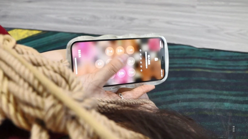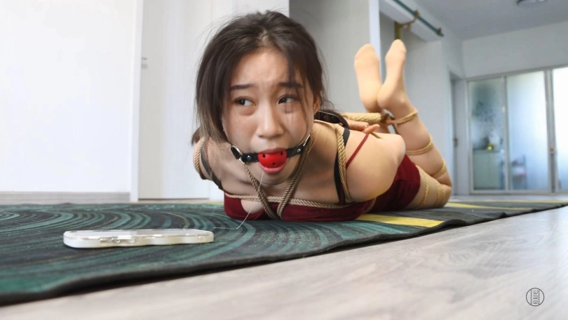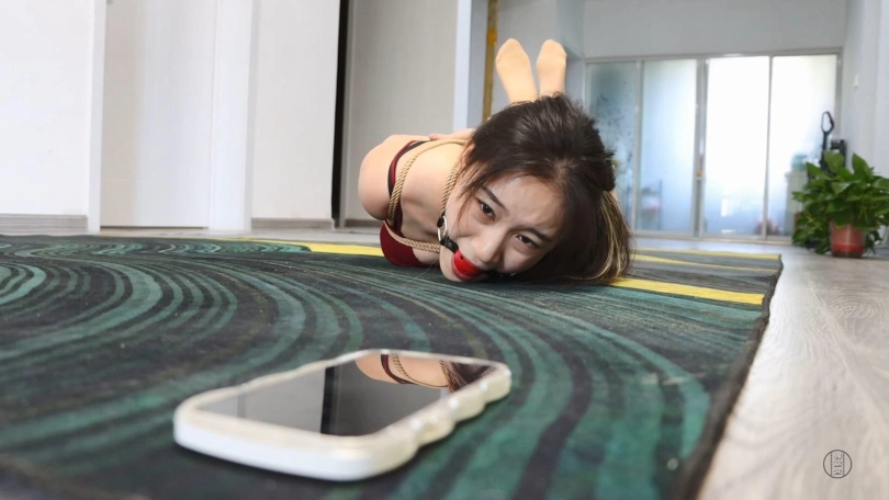 剧情接上集,思思被独自一人驷马紧缚放置在客厅地上了,活动范围非常有限,思思也只能勉强挣扎。过了一会思思的手机有新消息提醒,思思挣扎着想去看,但是绑的太紧了很难移动,反而越挣扎越紧。思思好不容易拿到了手机,播出了男友的语音,男友告诉她电梯坏了,物业正在修还需要很久才能上去(其实是骗她的)。思思听到后整个人都崩溃了,开始疯狂挣扎起来。过了很久男友终于上来了,但是非但不给思思解开还从头到脚的开始挠她,思思终于忍不住哭了起来,男友这才慢慢的解开了她。