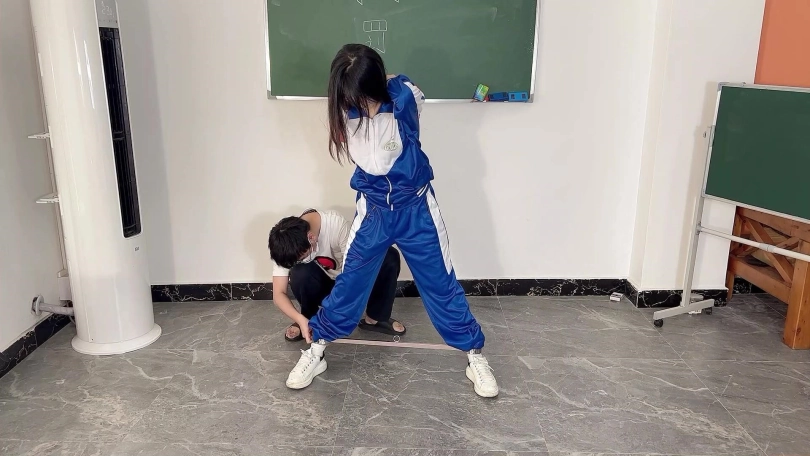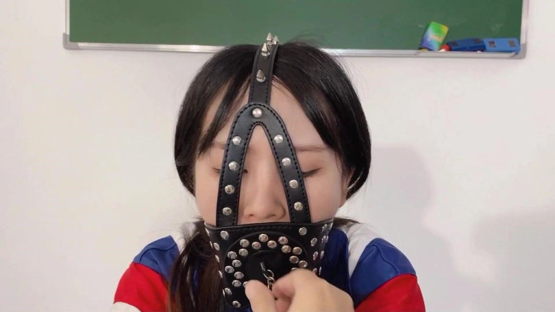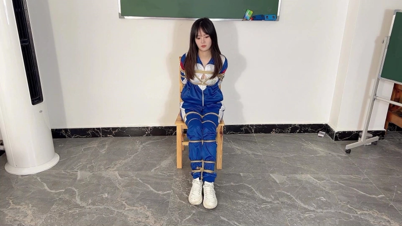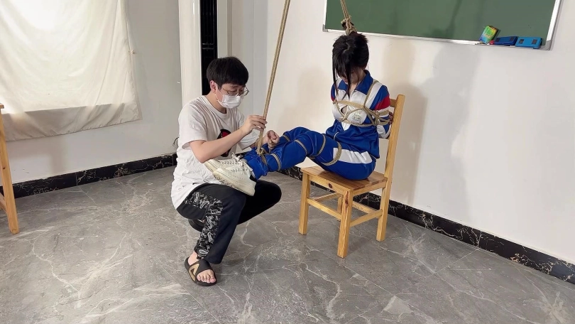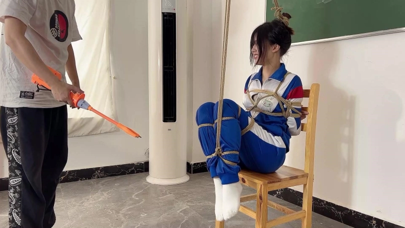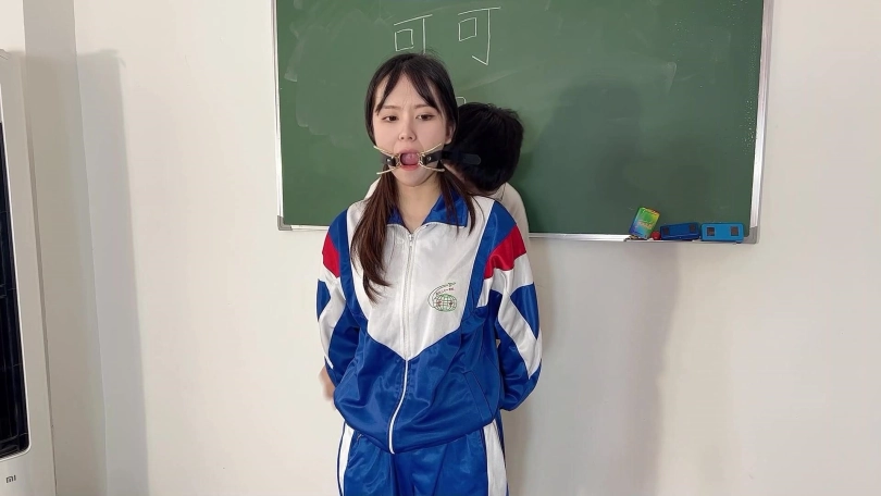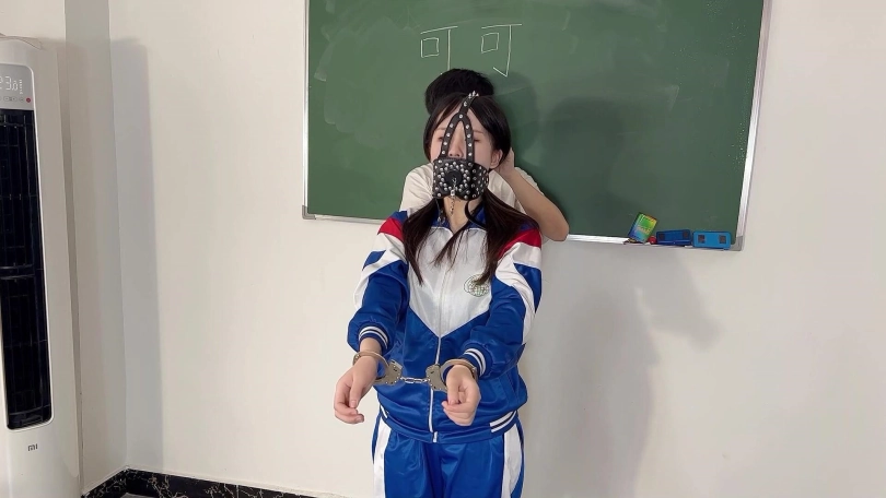 因为打扫卫生偷懒,被老师军训40分钟,带上头套,从头套的小洞中升出她那可口的小舌头。裤子里塞入TD,带上手铐原地跳,带上脚镣登马步。现在的学生一点不尊重老师,被处罚了还嘲笑老师,老师加重了处罚。把可可绑在凳子上,嘴里带上扣环,脱下鞋子饶痒痒,用纱布捂住她的樱桃小嘴并用电棒攻击小脚。可可还是被饶得不停的笑出声来,看来可可身体真是敏感。老师还把可可全身KB,并要求站着原地转圈圈,提出各种要求让可可完成。训得可可上气不接下气。最后老师满意的去上课了,留着可可原地反思。