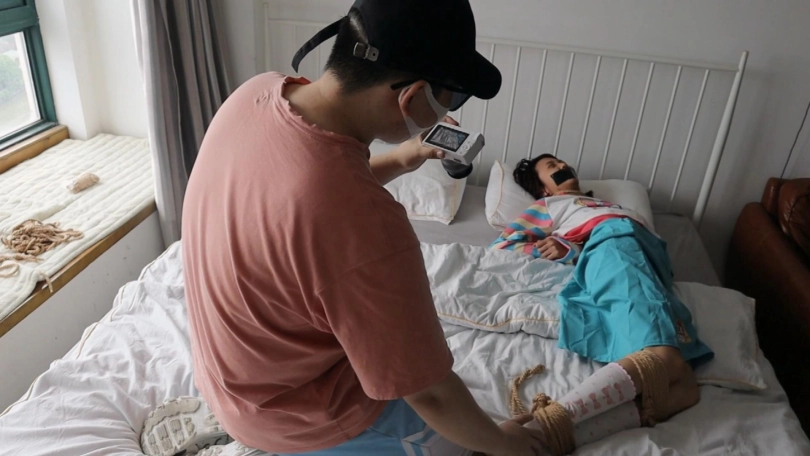 但又因为嘴巴被胶带死死的堵上 只能发出呜呜呜的叫声祈求摆脱束缚
