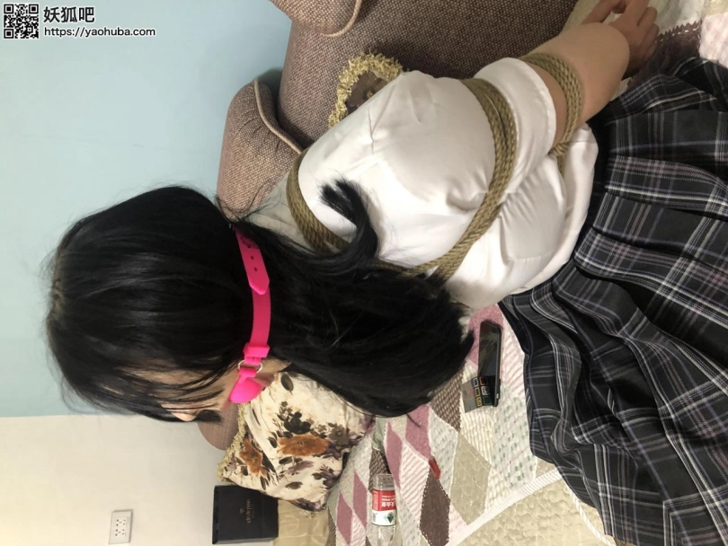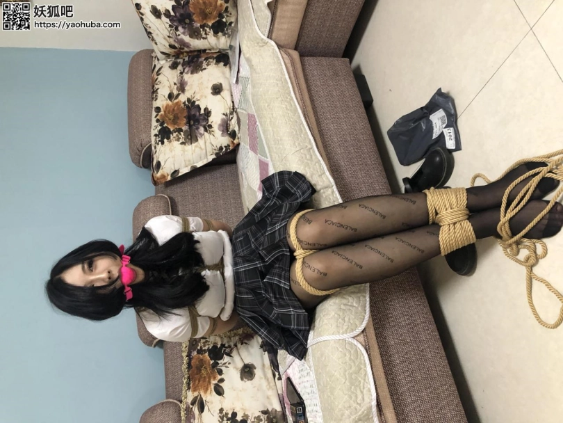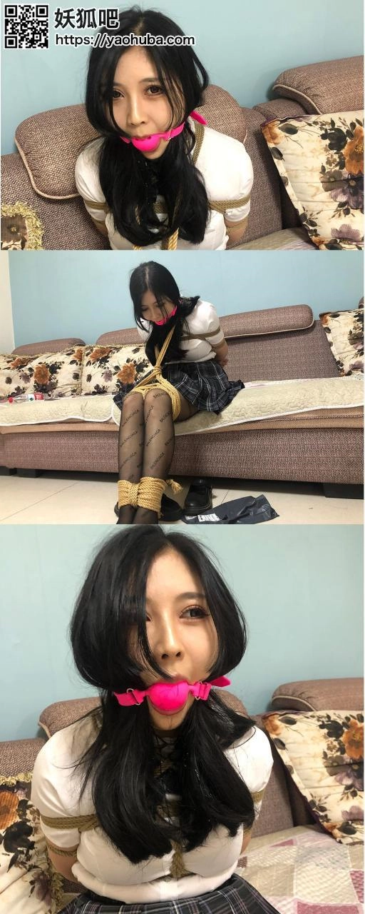 网红模特小雅下班后拿着快递到家了(丝袜)做到沙发上就开始拆快递,拆开丝袜后换上,因为忘记关门被乘虚而入的歹徒捂住嘴拖回家中,模特嘴里求饶让歹徒不要伤害他,歹徒同意后要求模特拿出家里的绳子和堵嘴道具,模特小雅便说出绳子和口球的位置,歹徒拿到绳子和口球后用绳子把模特绑上海老缚给模特紧紧戴上大号口球后便去寻找钱财去了,可是没有找到便要挟模特带路去找便放了她,模特便答应了,解开海老的姿势后然后把模特脚并拢绑好后让模特带路去,模特带歹徒来到存放钱财的地方,歹徒打开后是一张银行卡,把模特的口球取下,逼迫说出密码,模特被迫说了密码,于是问可以放了自己吗,可谁知歹徒反悔把模特脚膝和颈部用绳子紧紧连着一起捆住拿了一杯水让模特喝下又把大号口球塞入模特嘴中放置离开了。