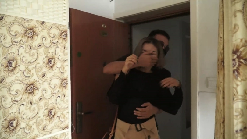 劫匪挟持申依瑶走到客厅,让其趴在沙发上手背后。