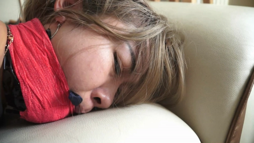 劫匪拿绳索将申依瑶捆成五花大绑,而后让其坐在沙发上。劫匪从申依瑶家里拿了条丝巾,一点点塞进申依瑶的嘴里。申美女的嘴被丝巾塞的满满的。