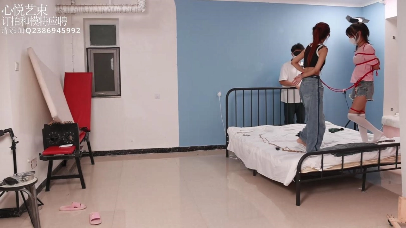 【心悦艺束】欢欢琳琳双人游戏最终章,本来想要把两个妹子一起连腰绑起来一起吊着得,结果脚绑住了站不住,后面就用了双重驷马,脚联动起来TK。最后有把两个人用绳子连起来玩躲猫猫游戏,抖S戴着眼罩抓两