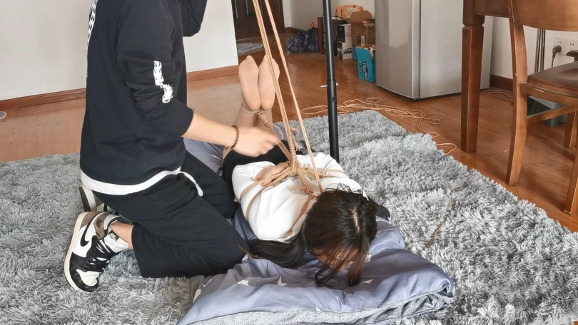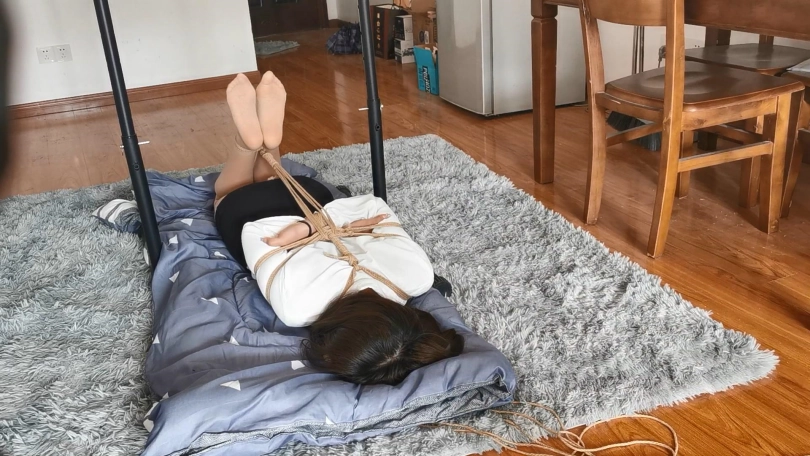 长相甜美的绒绒,绒绒身穿OL制服被日式驷马紧缚,这次的驷马放置跟以前的不一样,加了一道绳子把背后的绳子吊起来,这样基本上封死了模特挣扎的所有余地,想翻身都翻不过去,再用大口球堵嘴,口球也用绳子吊起来,就这样绑了模特90分钟的时间。绑前绒绒还说想放置的时候睡一会,放置结束后绒绒说一分钟都没睡着,只能不停摆动自己的丝袜小脚了。