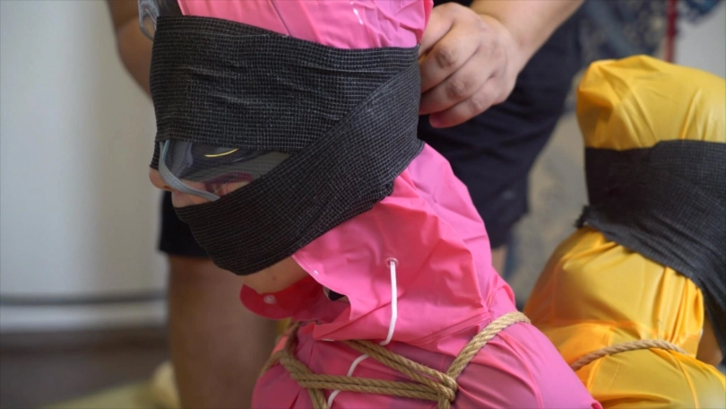 雨衣不防雨水,只能用胶带缠住她们的嘴巴。