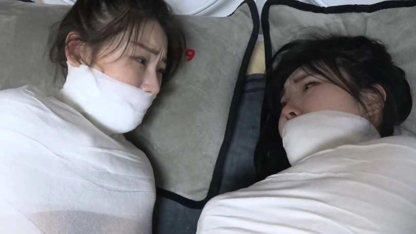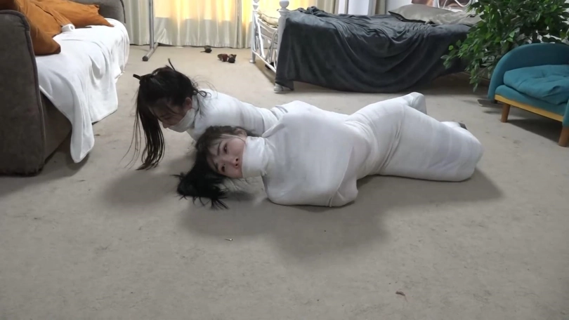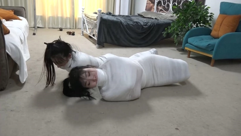 美女们彻底被洁白的绷带包裹成只露脸的木乃伊人茧,美女们只能奋力挣扎蠕动,想办法在地上爬行逃跑,但是被狱警发现,美女们连唯一的丝袜脚也被包裹,包裹的只露出可怜兮兮的眼睛。美女们彻底变成的洁白的人茧~