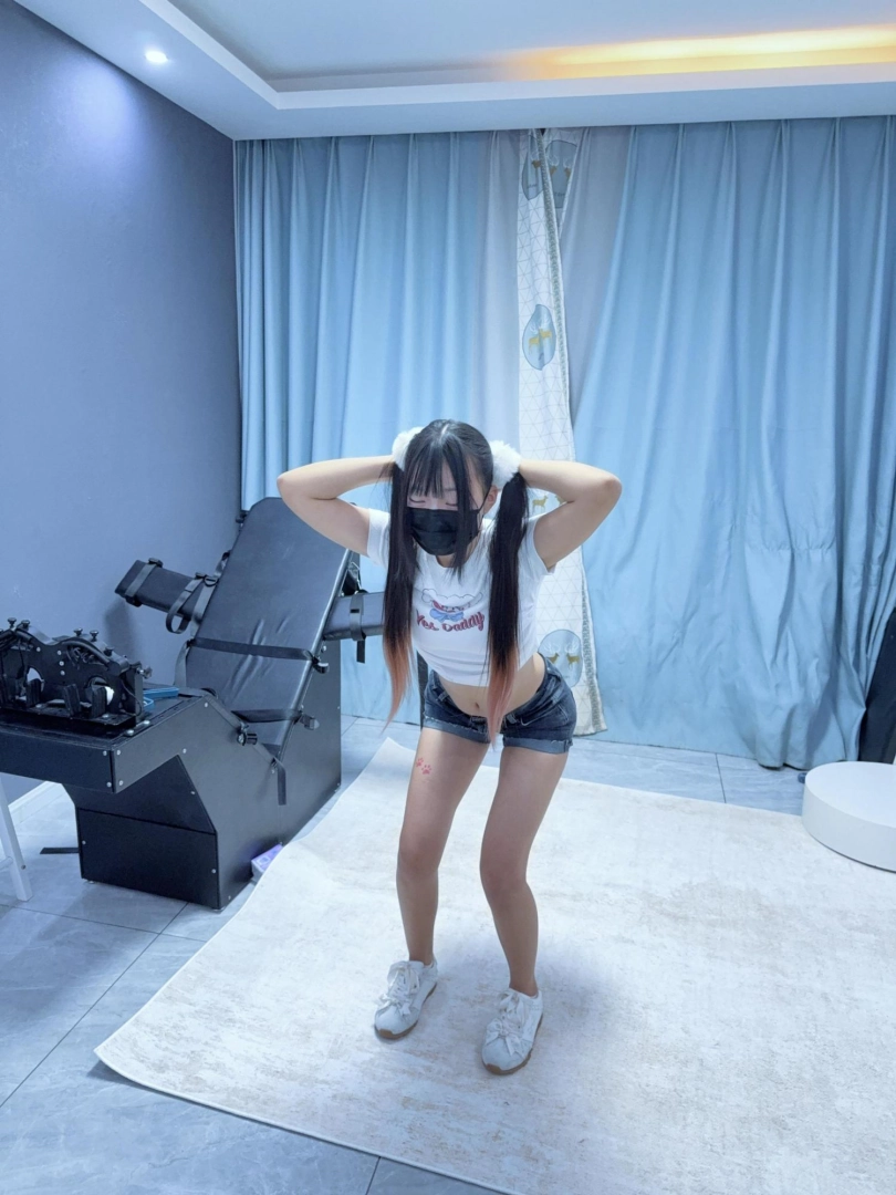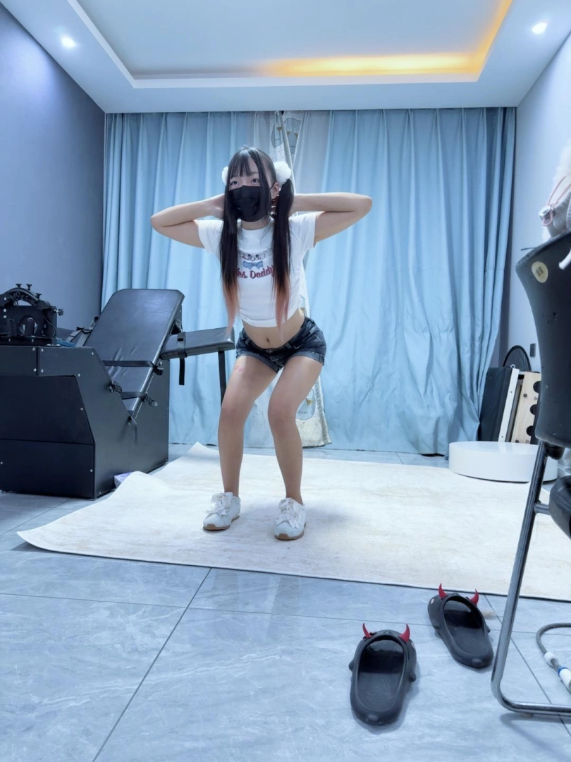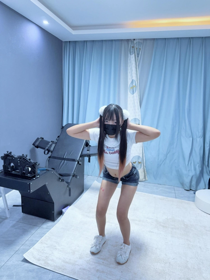 服装:双马尾、紧身露脐短袖、超短裤、小白袜、休闲鞋
