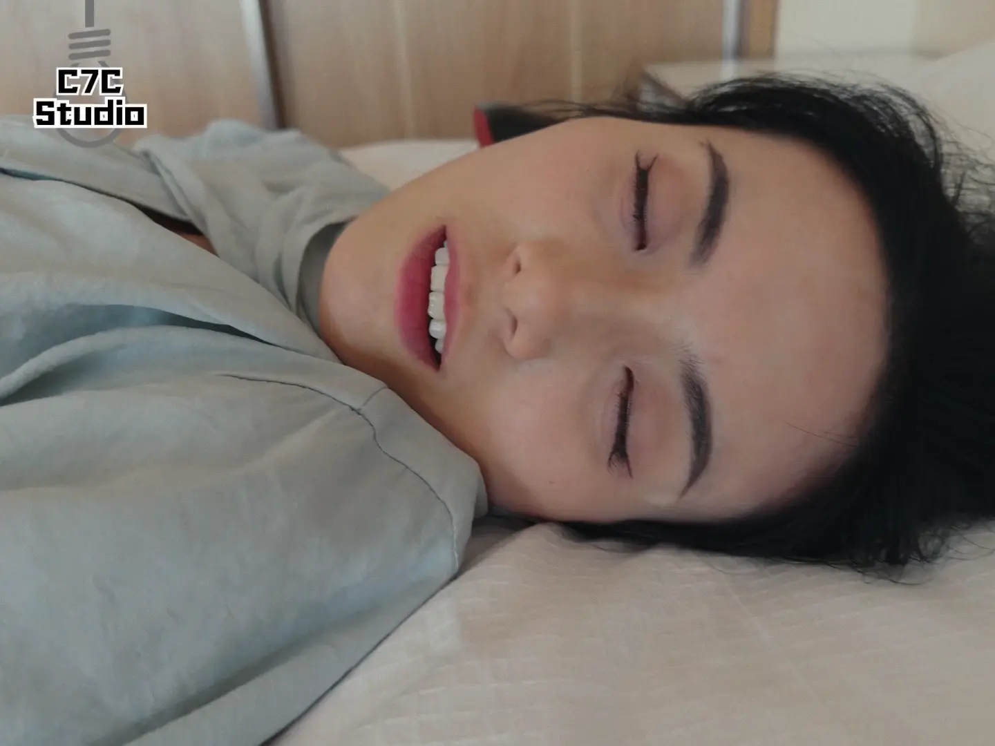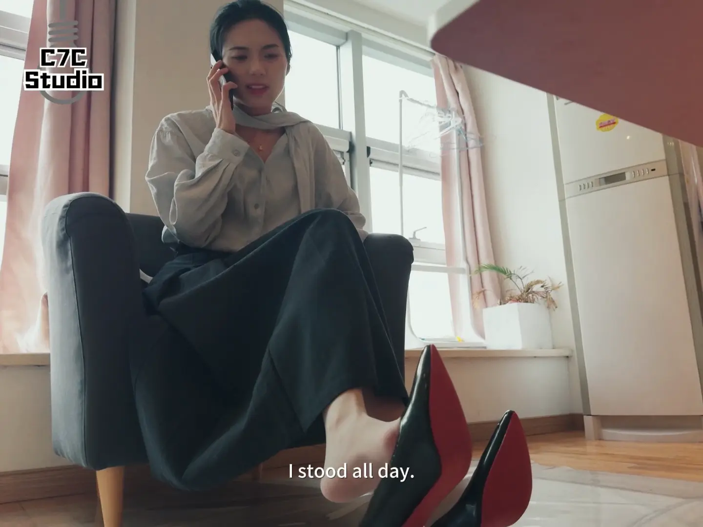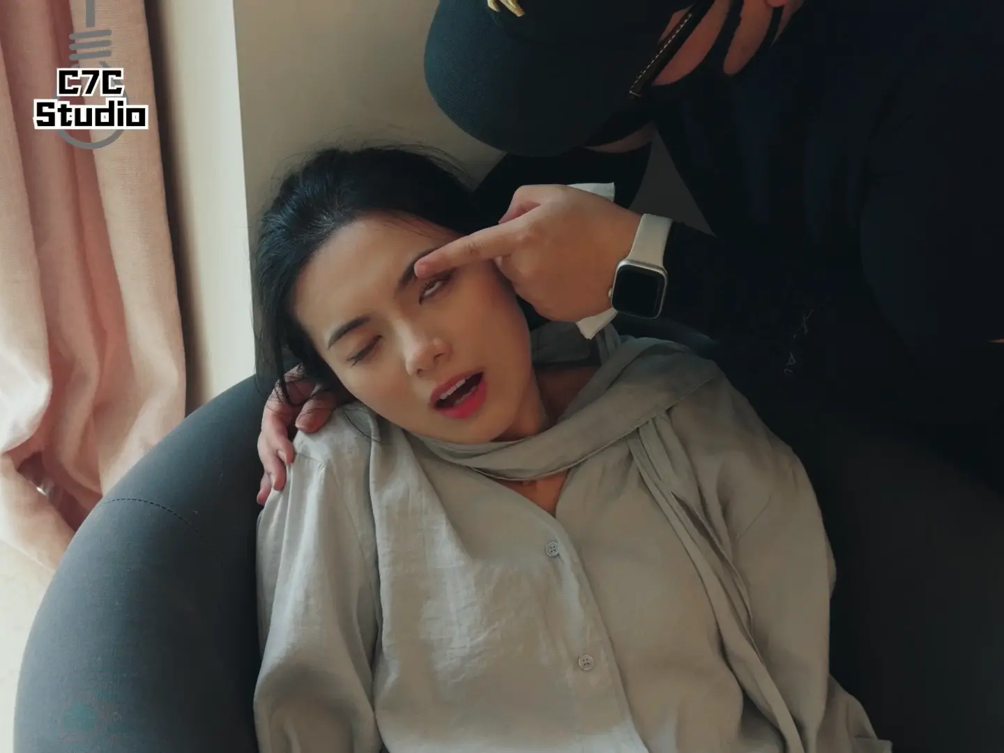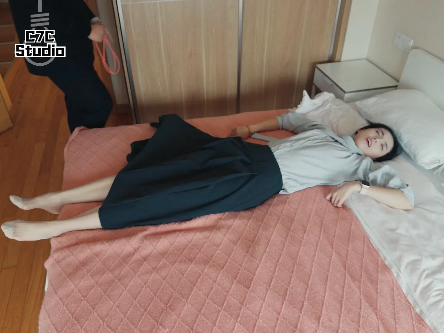 小姐姐下班后坐在沙发打电话揉脚,随后被入室的杀手闷晕,杀手将她拖到床上掐死,小姐姐疯狂翻白眼抽搐挣扎,死后被杀手玩脚