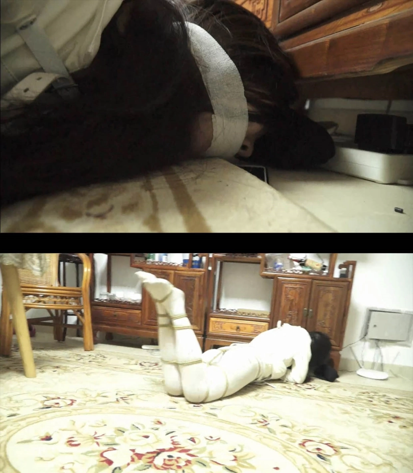 美女又换回了拘束衣,绳子把她的丝袜美腿捆绑到一起了。