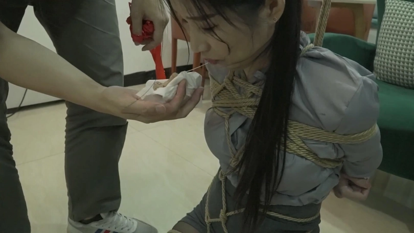 挑战1.日式驷马跪缚,将一把钥匙放在丝袜里,把丝袜揉成一团塞进嘴里,再用胶带把嘴巴封起来,思思要在10分钟内用手拿到丝袜中的钥匙,否则任务失败。