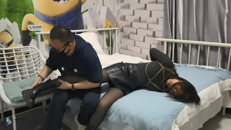 劫匪潜入女人家中,等女人回家被劫匪从后面捂住嘴巴将其捆绑在凳子上。女人挣脱了束缚,刚跑到门口就被劫匪抓了回来。生气的劫匪脱掉她的靴子将女人驷马捆绑在床上。嘴里塞上布团,外面用胶带封堵。劫匪开始猥琐女人,抚摸她的全身,亲吻她的丝袜脚。最后离开。最终女人挣脱束缚成功自救。