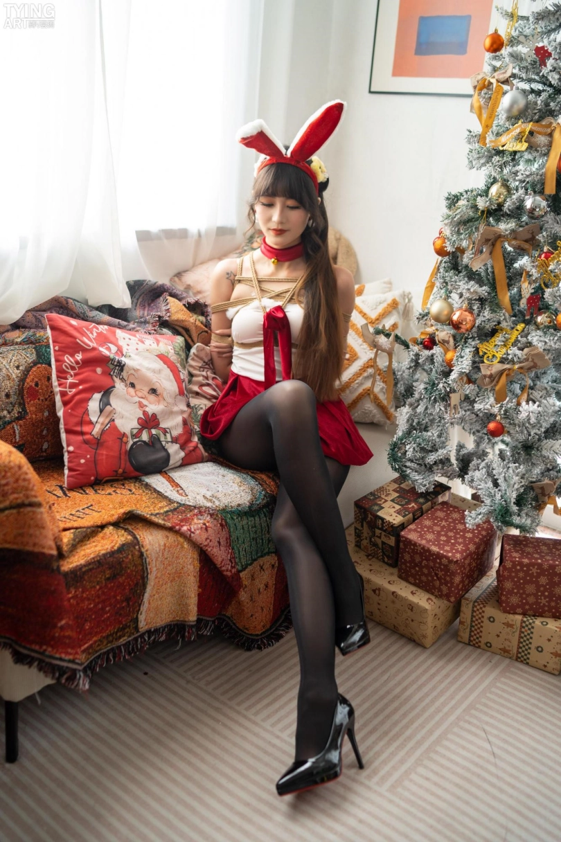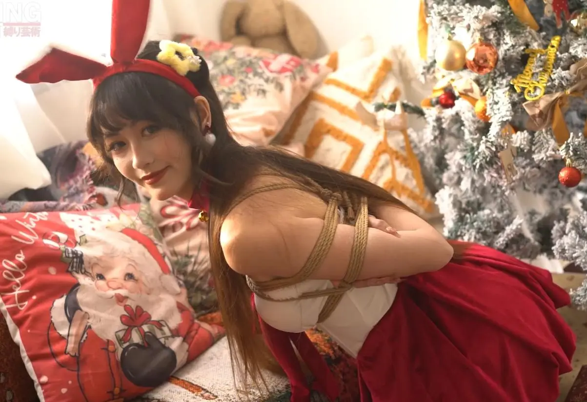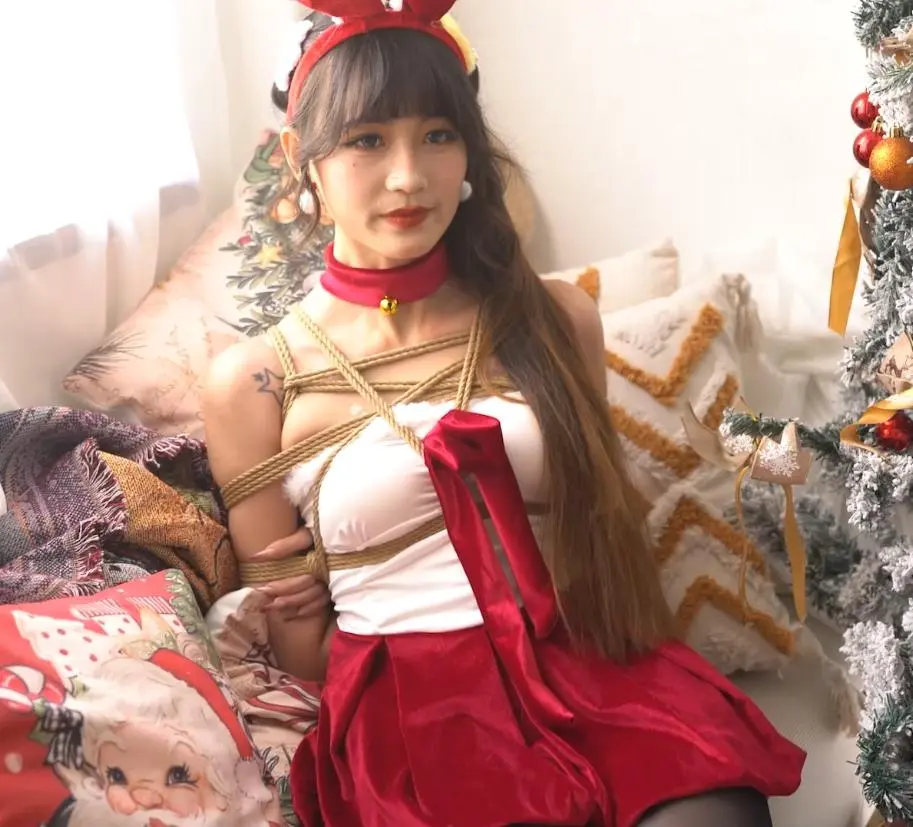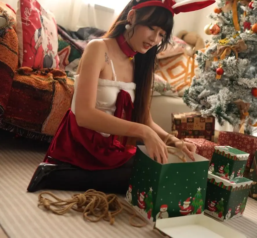 模特Mmi,圣诞写真,打开礼物盒,里面是用来捆绑的绳子。