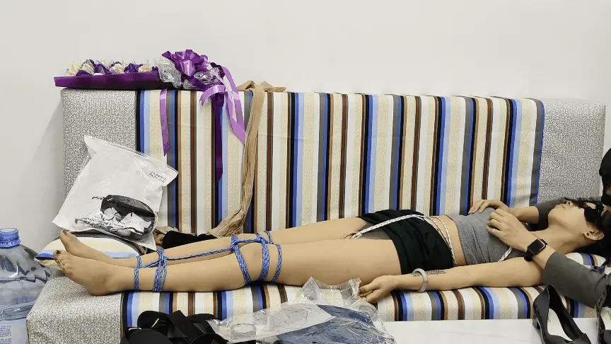 【睡美脚】【诺米家中自缚遭劫】自缚面罩开档肉丝袜ZWZDB捂晕抚摸翻白眼手铐