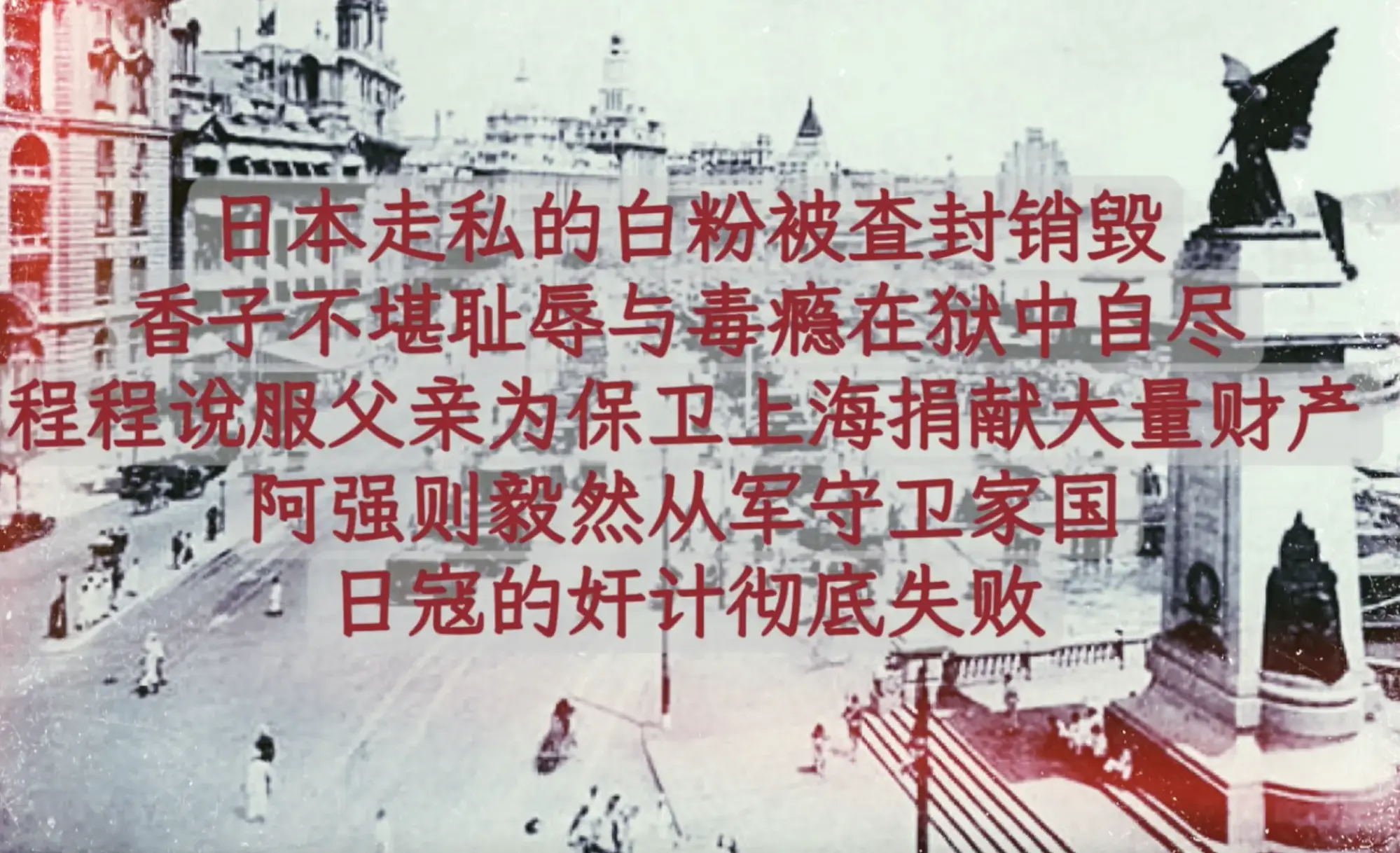 整合了经典影视《上海滩》的情节,片头片尾带上了“浪奔浪流”的音乐背景:日军入侵上海前夕,暗遣女特务香子(喵喵 饰)借助白粉控制当地名流,以瓦解中国军民斗志;香子很快盯上了首富之女程程(土豆 饰)……