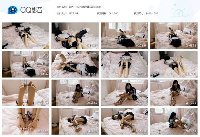 妹子醒来,发现被绑架了,一只脚的鞋袜被脱下,钥匙锁在脚趾铐上,双手锁在一只脚上,另只脚用脚镣绕其一圈,很难受的姿势。妹子十分难受,各种挣扎,发现了钥匙,企图够到钥匙却办不到。坏人回来了,给妹子换个姿势。妹子驷马铐住,钥匙仍然锁在一只脚趾上。妹子更难受了,各种挣扎,企图够到钥匙却办不到,很害怕,哭了。坏人又来了,给妹子换个姿势。妹子手脚抱在一起。妹子十分害怕,挣扎,哭了。