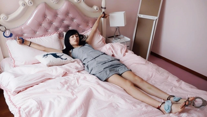 妹子醒来,发现自己被带上了脚铐,一只脚还被拴了起来,下不了床,很着急,一直拉拽却没用。坏人回来了,让妹子把鞋袜脱下来,戴上脚趾铐,袜子放在脚面上。妹子很着急,拉拽,求放出去。坏人又回来了,给妹子一副手铐,让她铐在背后,妹子被迫就范。妹子哭了,拉拽,求放她出去。坏人最后回来,换了个姿势 ,大字绑上。妹子被大字绑在床上,哭了,很害怕。