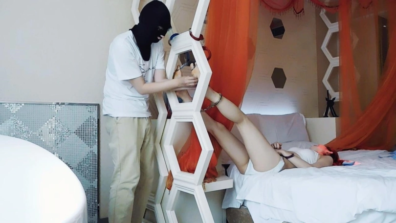 妹子一个人回家,看到了床上的镣铐,心想玩点刺激的事情,于是脱下鞋袜。锁住脚趾脚腕,塞入[不可描述],走到架子前,把一只脚拴起来,手上着钥匙,双手分别锁在栏杆上,钥匙拿在手上。妹子自己玩的很爽,扭动身体。妹子想解开手铐,结果钥匙掉在了地上。这下妹子惨了,企图用脚够钥匙,但是双脚被拴住活动范围也很小,而且还脚趾也被锁了,这下妹子可着急了,呼叫救命。男室友回来了,听到喊叫,马上前去,结果看到了此场景。问清之后,室友决定要挟妹子,让妹子以后和他一起玩,妹子无奈下只好答应,室友拿走了剩下的钥匙,并捡起地上的钥匙,放到妹子嘴里,离开。妹子十分惊恐,嘴里的钥匙看得见却拿不到,很着急。最后,坚持不住了,钥匙掉在了地上,妹子大叫并且哭泣。室友回来了,解开妹子,放在床上,把她双手锁在后面,双脚吊起来锁住,脚趾分别锁在一栏杆上,离开。妹子十分惊恐,一直求饶。室友回来了,挠妹子脚心,妹子一直扭动大笑。然后离开。妹子彻底被拴住了,非常难受,哭了。