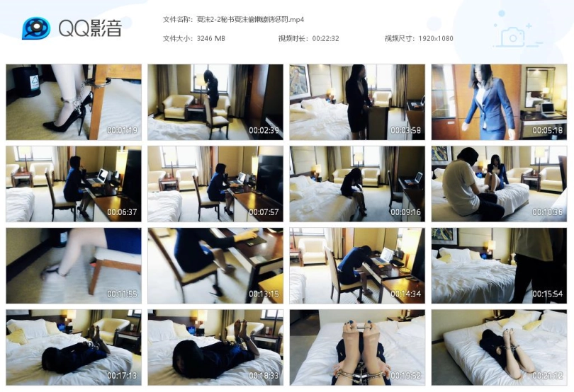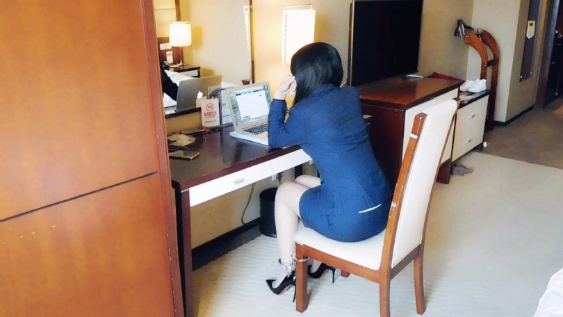 秘书被老板批评,因此被老板用长脚镣锁在椅子上办公,一只脚拴在椅子上。秘书干了一会,想偷懒,拉着椅子到处走,然后发现脚镣从椅子上弄下来了,很开心。老板回来看,秘书竟然没好好办公,而且从椅子上跑了出来,于是把她的两只脚都锁了起来,让她好好工作。秘书干了一会又不想干了,戴着脚镣下地走走,活动一下。老板再回来了,发现秘书又没好好办公,撕开丝袜,锁上脚趾铐、板铐脚腕,让她在椅子上好好工作。秘书工作一会,又累了,看着动不了,索性趴桌子睡了。老板看到后,十分生气,把秘书弄到床上,驷马镣铐,留下秘书走了。秘书挣扎很难受,一边求老板回来,一边咒骂老板。