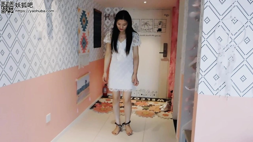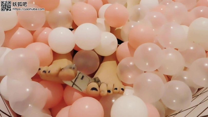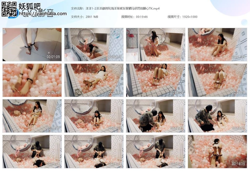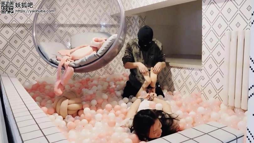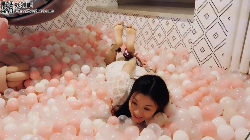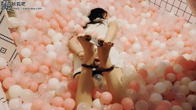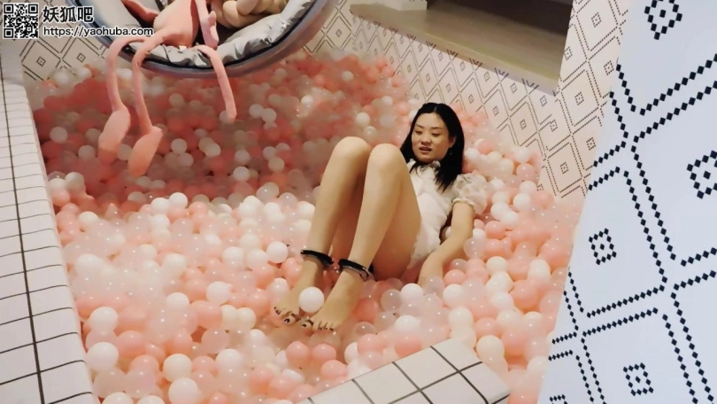 妹子回到家,戴上脚镣走上楼,玩海洋球,再戴上脚铐、脚趾铐、手铐。当她想解开的时候发现没有钥匙,朋友忘了给他钥匙。朋友来给送钥匙,正好撞上妹子在玩,于是绑成驷马,挠脚心玩耍。