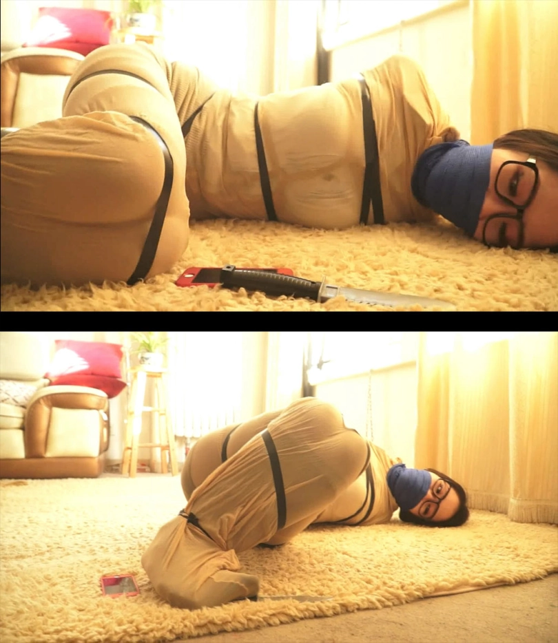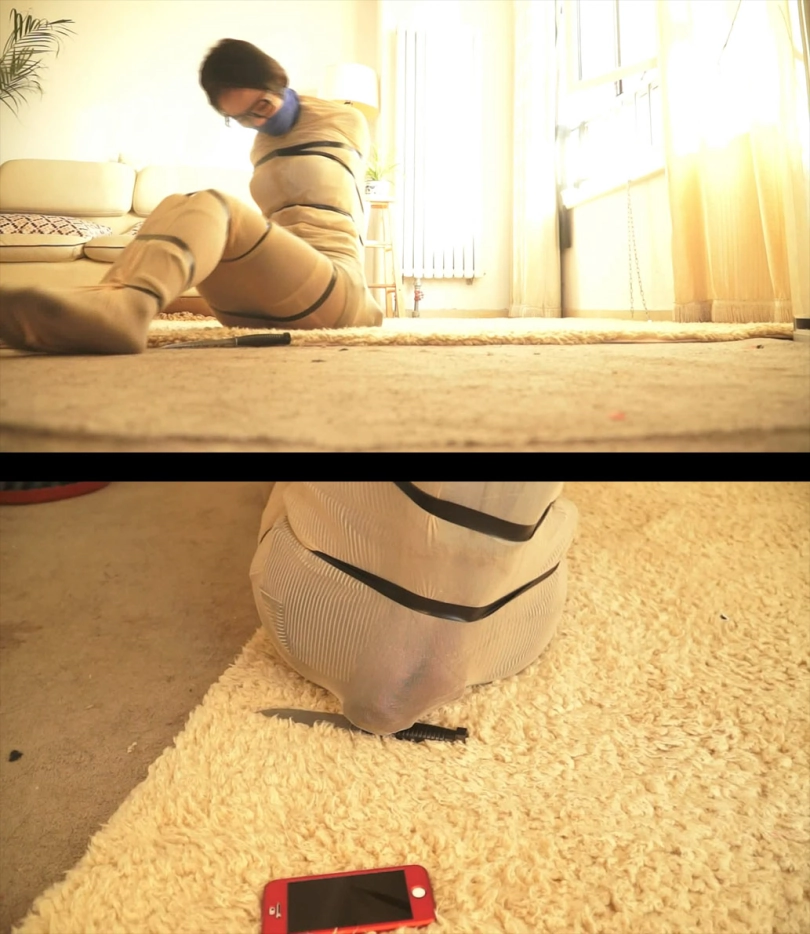 男人离开了,美女挣扎去尝试小刀和手机,但因为脚被包裹了3层丝袜所以根本连脚趾都用不了,而她的手也被包裹了2层丝袜,所以太滑根本拿不起小刀和手机,急的她呜呜大叫。