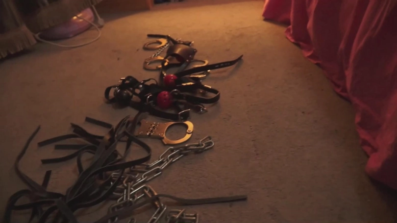 她拿出皮鞭摆在地毯上,拿出 金属脚镯给 自己脚踝上 带上,并连上了一根金属横棍,她看了看