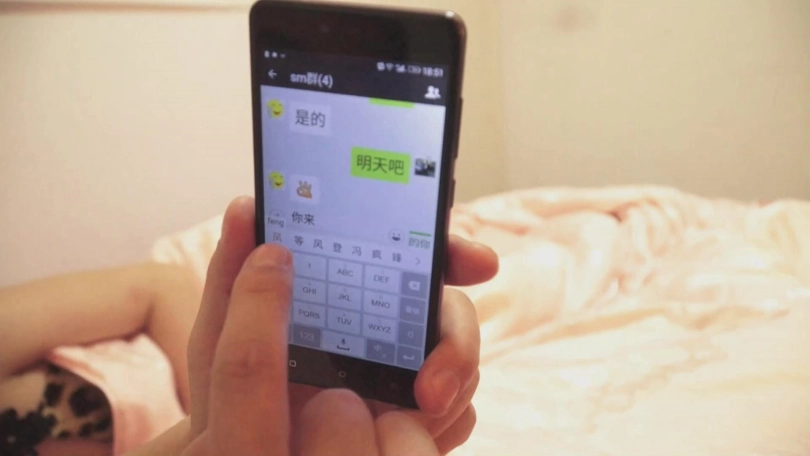 终于两人都累了,王力和小晗盖着 被子,小晗侧身已经睡去,地上散落着金属拘束工具,王力在玩着手机微信。