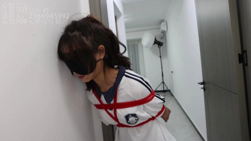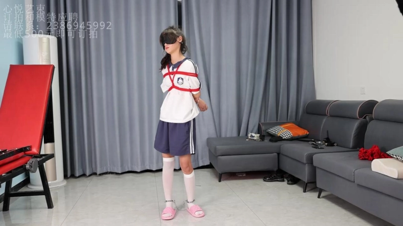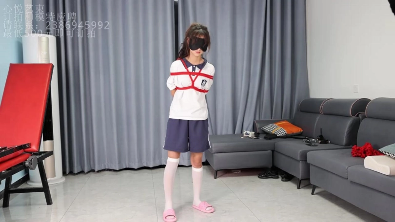 被紧缚蒙眼戴着脚镣的欢欢,在什么都看不到的状态下,用手体验一下我给她的卡片,然后要在一百多平的房间当中找到这张小卡片。是在拘束状态下哦。(PS:其实我把卡片藏身上了,她瞎找半天哈哈。)