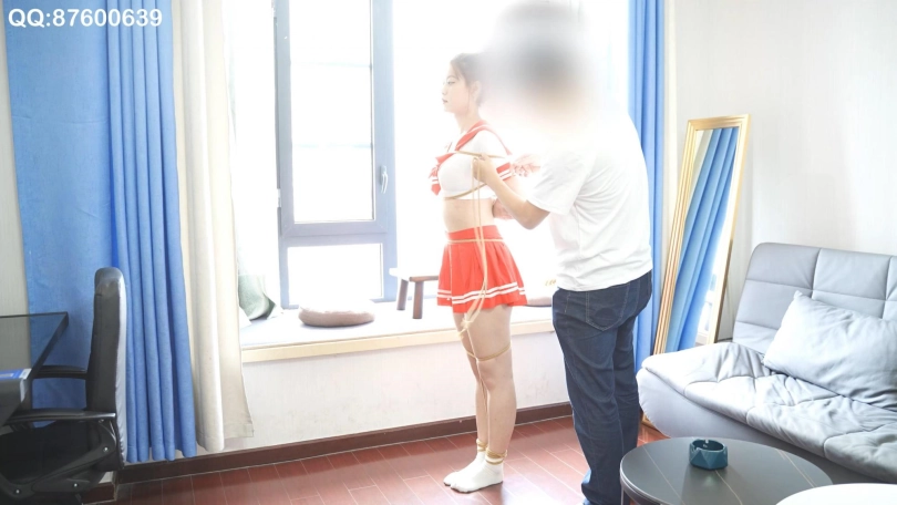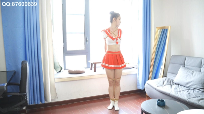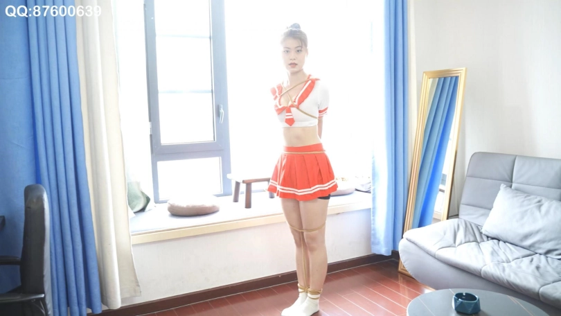 妹纸胸型不错,合适这套红裙学生装,还是绑驷马,考验妹纸柔韧。