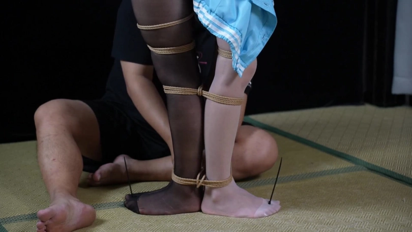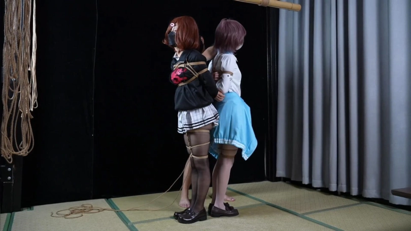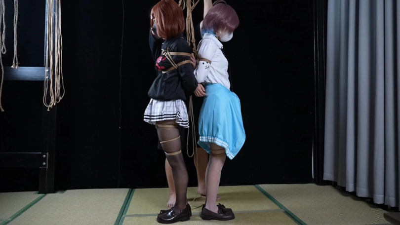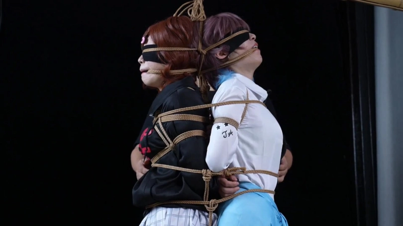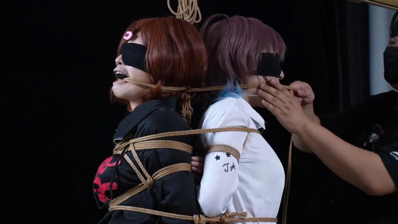 纯捆绑片无剧情。两位模特背靠背绑在一起(全程被装了TD玩具,捆绑过程中两人都只能默默忍受)身上自由活动的空间越来越少,脚趾被扎带绑住,腿被绑在一起,嘴巴一起被勒住,脑袋靠在一起同甘共苦。