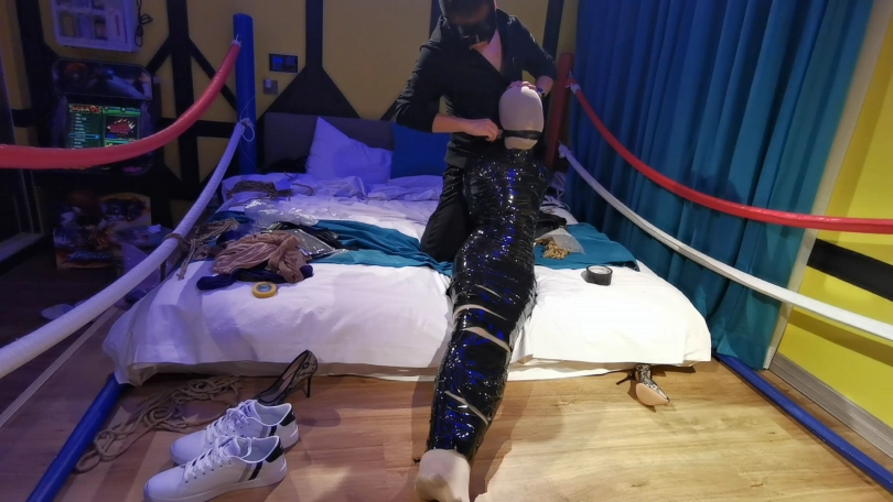 先用丝袜将身体全部包裹起,在用胶带木乃伊捆绑,胶带缠绕封嘴,用振动棒不断刺激,高潮的快感使瑾萱挣扎身体,扭动双脚。但无济于事,只能呜呜的体验振动带来的快感。