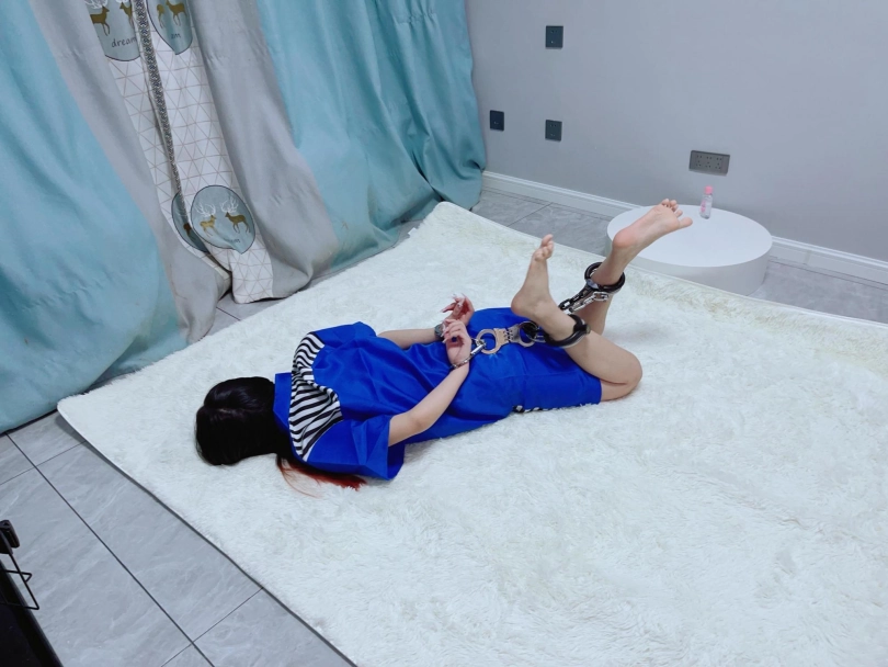 首先给糖糖戴上最严厉的板铐,反铐在身后,然后给糖糖戴上女死囚级别的重型脚镣(10斤),期间糖糖略有不满,作为惩罚又加了一副重镣!